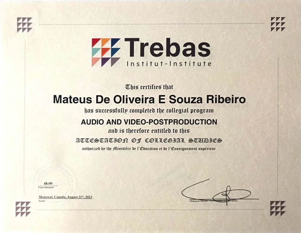 2023 •Diploma - Click to enlarge My journey in Canada begins in Montréal, where I graduated in Audio and Video Post Production, after studying for 2 years at Trebas Institute Montréal. Learning in the heart of the global audiovisual industry was an unfergettable experience. This is my capstone project, showcasing the several assignments we made throughout the course: |